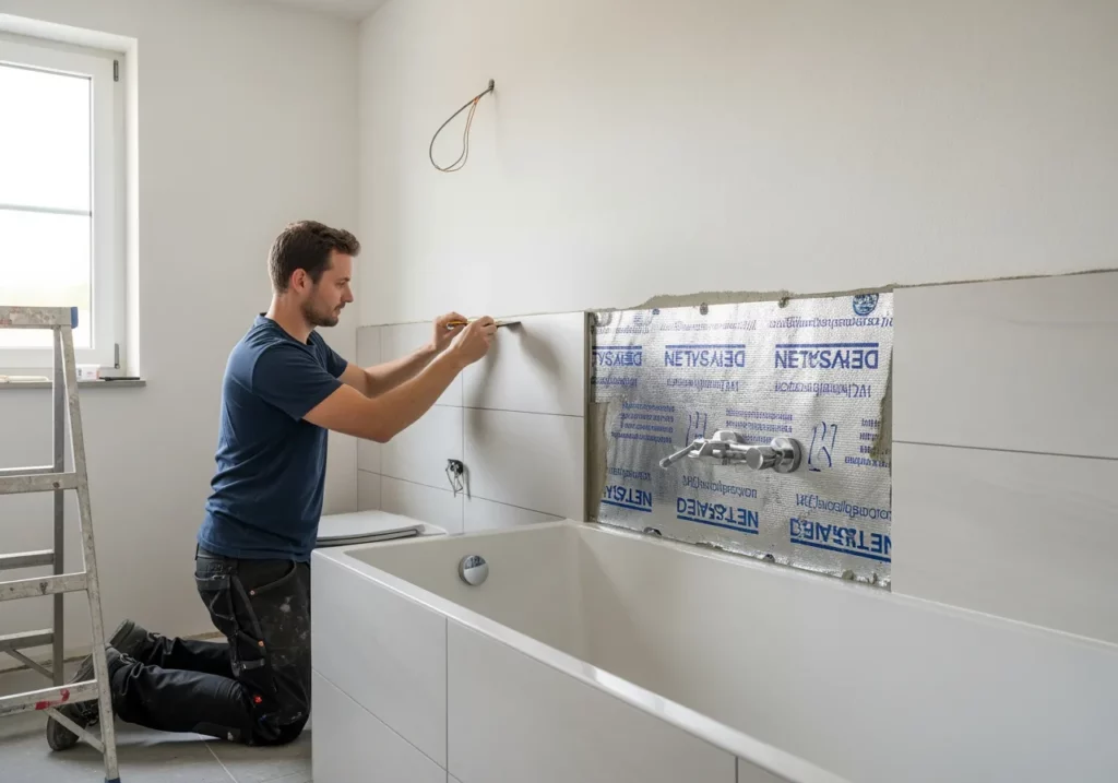 Les travaux de plomberie et d’électricité sont réalisés cette semaine. Votre artisan pose les nouvelles canalisations, les évacuations, les arrivées d’eau et les points électriques (prises, éclairage, ventilation). Il applique également les membranes d’étanchéité sur le sol et les murs, notamment dans la zone de douche. Cette étape est cruciale pour garantir la durabilité de votre installation.